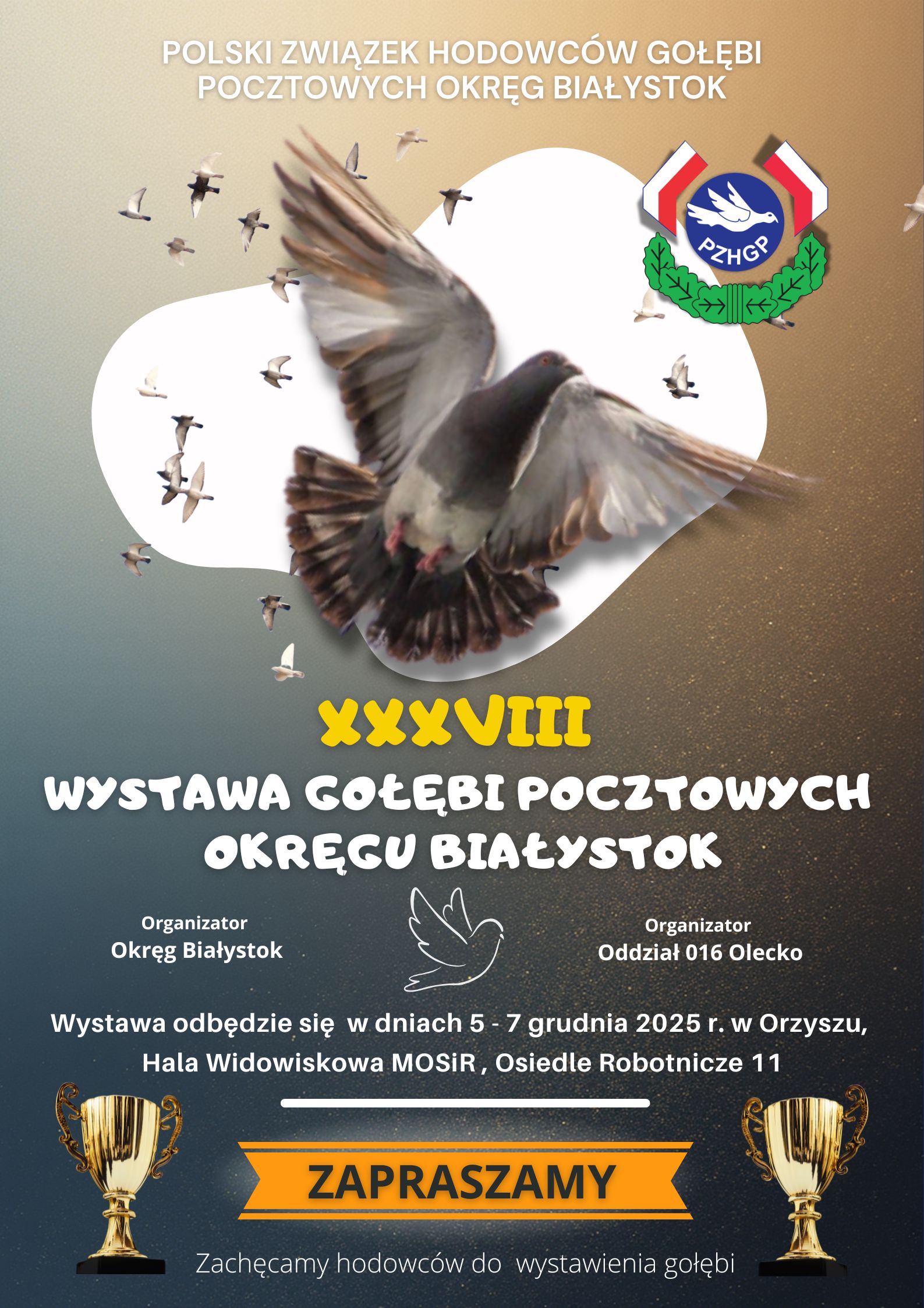 XXXVIII Okręgowej Wystawy Gołębi Pocztowych jest Oddział 016 Olecko. Wystawa jest charytatywna i rozwojowa. Wystawa odbędzie się w dniach 5-7 grudnia 2025 roku w hali widowiskowo - sportowej MOSiR przy ulicy Osiedle Robotnicze 11 w Orzyszu. Deklaracje obowiązkowo potwierdzone przez macierzysty Zarząd Oddziału należy dostarczyć organizatorowi wystawy do dnia 25.11.2025 r. Szczegółowy komunikat dotyczący wystawy, regulamin i klasy wystawowe dostępne w poniższym linku.
